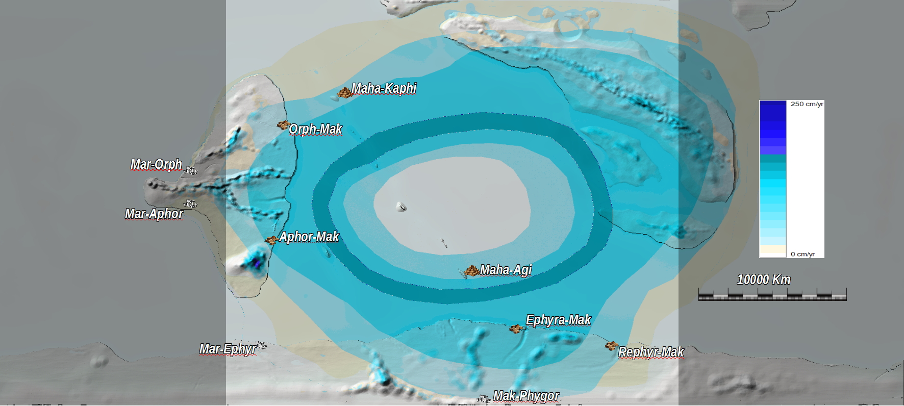 4. Poseidon Niederschlagskarte als Zylinderprojektion. Grau = kein Niederschlag, tiefstes Blau = 2500mm Jahresniederschlag (Erdjahr). |