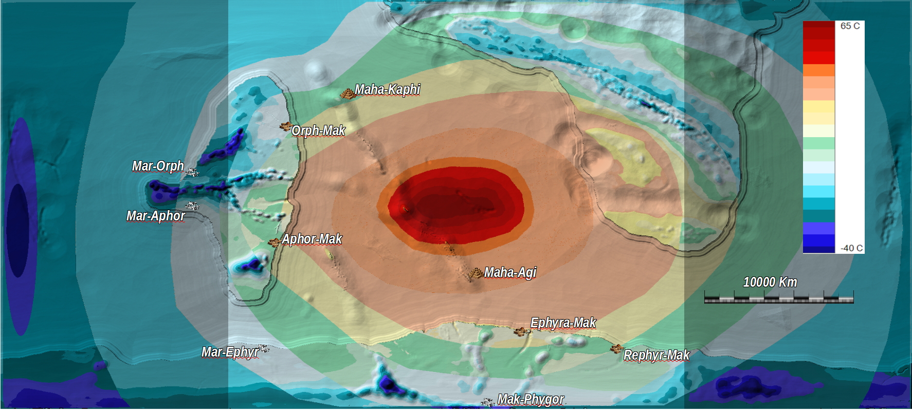 2.2 Temperaturen und Niederschläge, Sicht aus südwestlich vom Stellarpunkt verschobener Position mit Schattierung der Nachtseite. | |