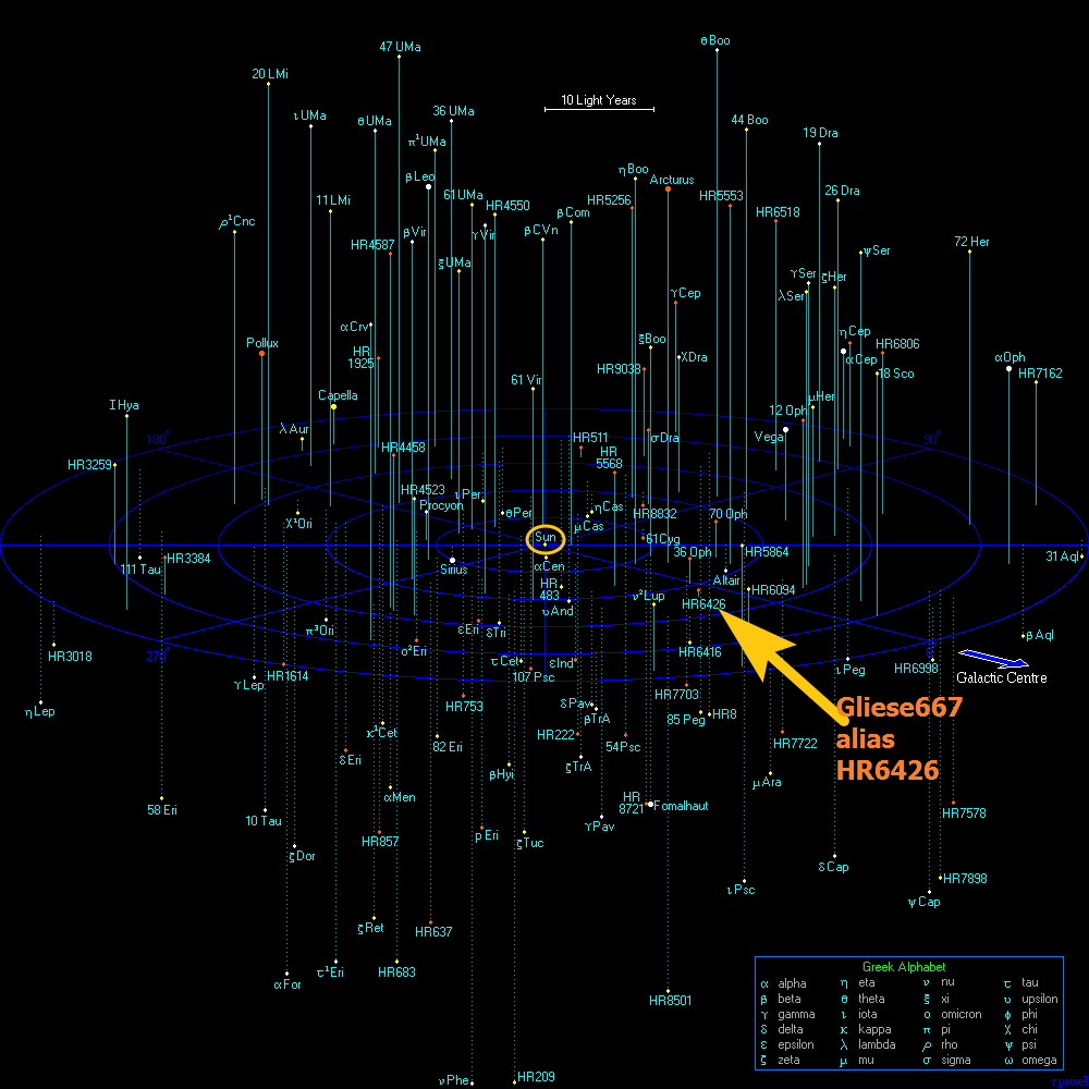1. Position von Gliese667 innerhalb der Sterne im Umkreis von 50 Lichtjahren um die Sonne. |