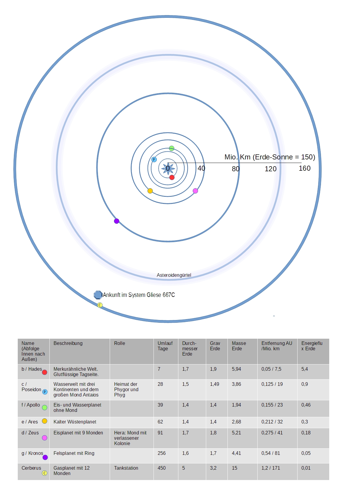 2. Aufbau des Sonnensystems von Gliese667C, der kleinsten von 3 Sonnen im Gesamtsystem. |